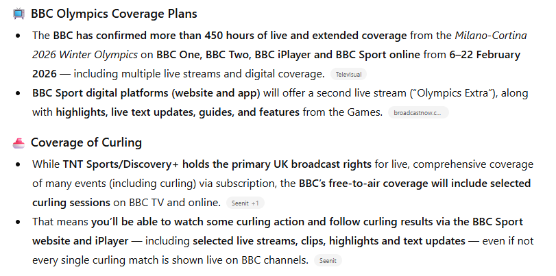 - BBC may provide some free-to-air highlights or selected coverage alongside TNT Sports, but full live curling is generally on TNT Sports/discovery+.